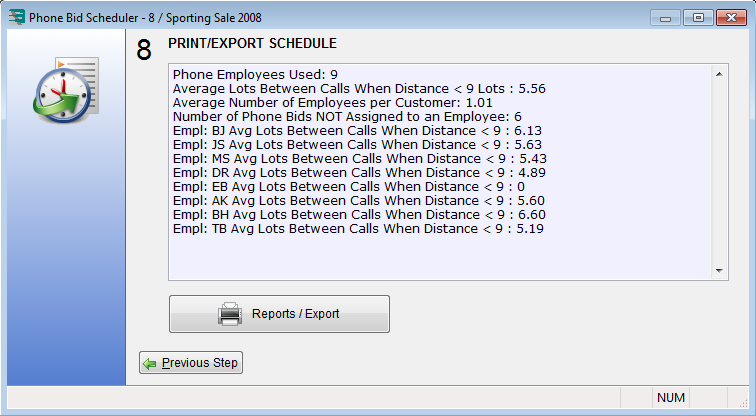 As you can see, the various criteria above can make for a daunting manual task that takes many, many hours and results in a sub-optimal schedule at best. The Auction Flex phone bid scheduler takes into account all the criteria above and automatically produces a schedule that optimizes both employee-to-phone bidder stickiness and lots between phone calls. When the phone bid scheduler has generated the schedule, it then produces: